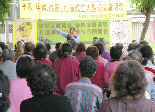 台南縣議員郭瑞南服務處昨天上午於甲頂里社區運動公園籃球場,召開爭取永康市﹁甲頂、尚頂﹂社區成立大型公園說明會。